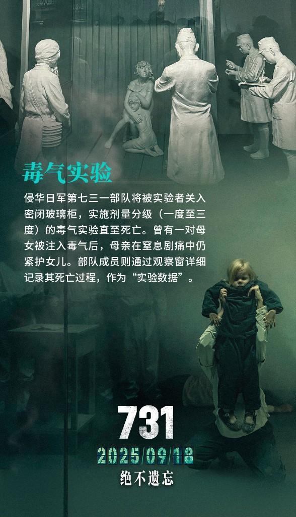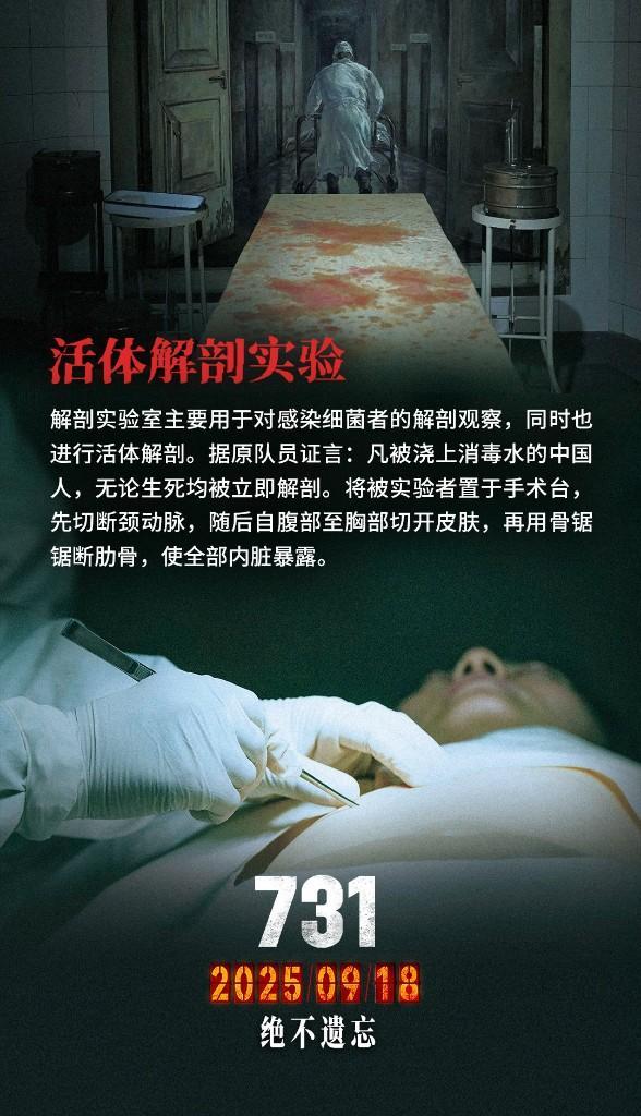 8月12日,记者从长影集团获悉,电影《731》通过该片官方微博发布组图,揭开活体实验真相,并发文:“穿透‘科学’表象,直视反人类暴行。每一组‘实验数据’,都是同胞泣血的控诉。铭记,只为永不重蹈。”