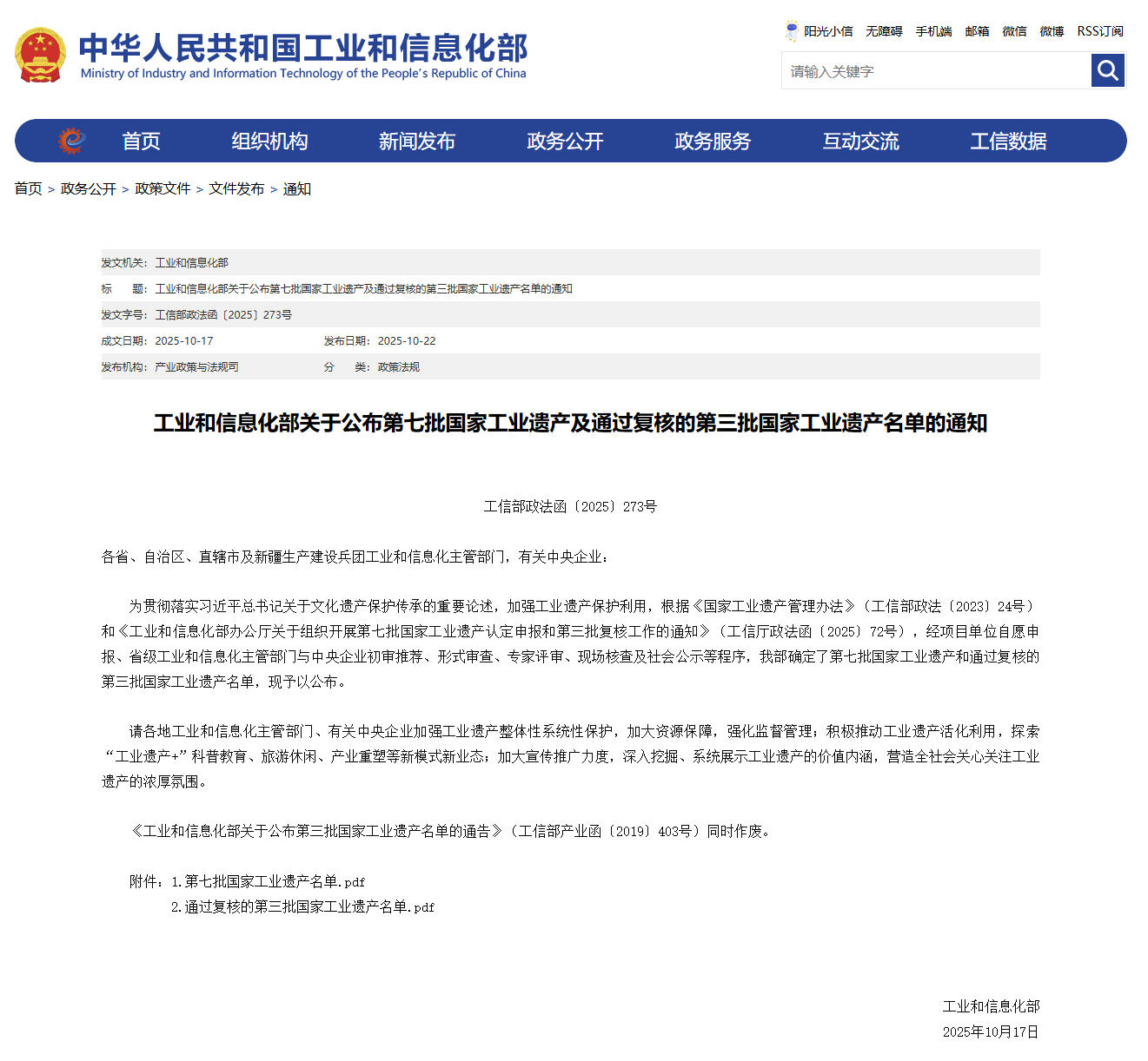 ●近日,工业和信息化部发布《关于公布第七批国家工业遗产及通过复核的第三批国家工业遗产名单的通知》。其中,第一汽车制造厂、丰满水电站入选第七批国家工业遗产名单。