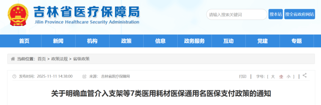 ●11月11日,吉林省医保局发布《关于明确血管介入支架等7类医用耗材医保通用名医保支付政策的通知》。详情点击