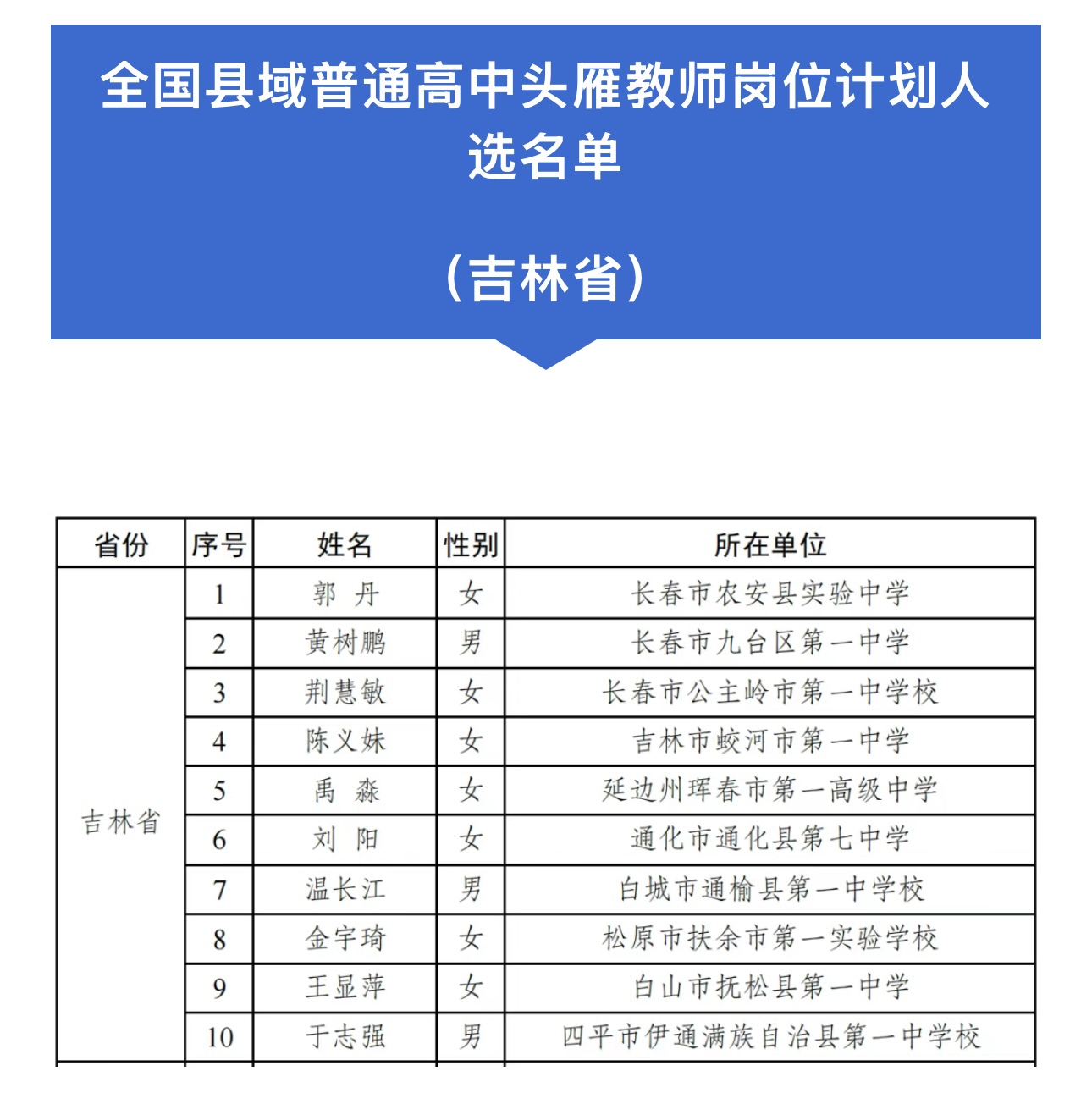 ●近日,教育部办公厅发布通知,公布首批全国县域普通高中头雁教师岗位计划入选教师名单,吉林省共10名教师入选。